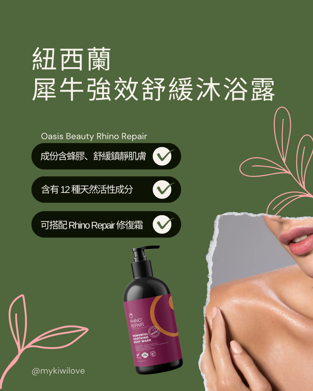 Rhino Repair® 強效舒緩沐浴露含有 12 種天然活性成分,可溫和清潔敏感肌膚。